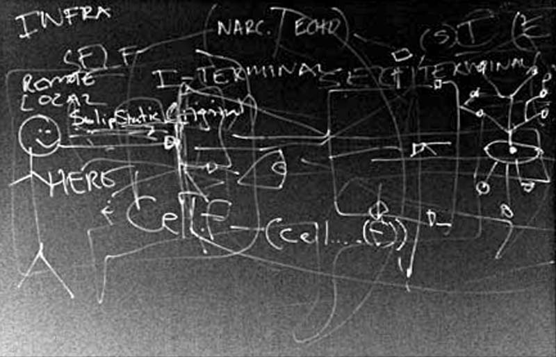 | ...the exo-psyche is susceptible to the same swings and re:motions as the original. The trans|missive agent may fail at anytime. It is, after all, the nomad of the middle-where, as well as the hero of the bi.narrative construct. As such, the transmissive agent is engaged in a far more rigorous mythos than that of the original. I look completely different on TV, on the screen, in photographs, in text... But, this is timeless and natural -- the achronic chronic act of synama -- as Laing states, "if {I == 1 && I==0}; metastrophe true; else {I==[x]} & exe.stream true." This complex is constructed through the mediation of self with other, and self through cell.f. It is the task of the trans|missive agent, the inverter and inventor of the mask and screen to exe.pand the interpenetration of public and private space. The I.terminal locates the public within the private, at face value, while making the private public through communification... |